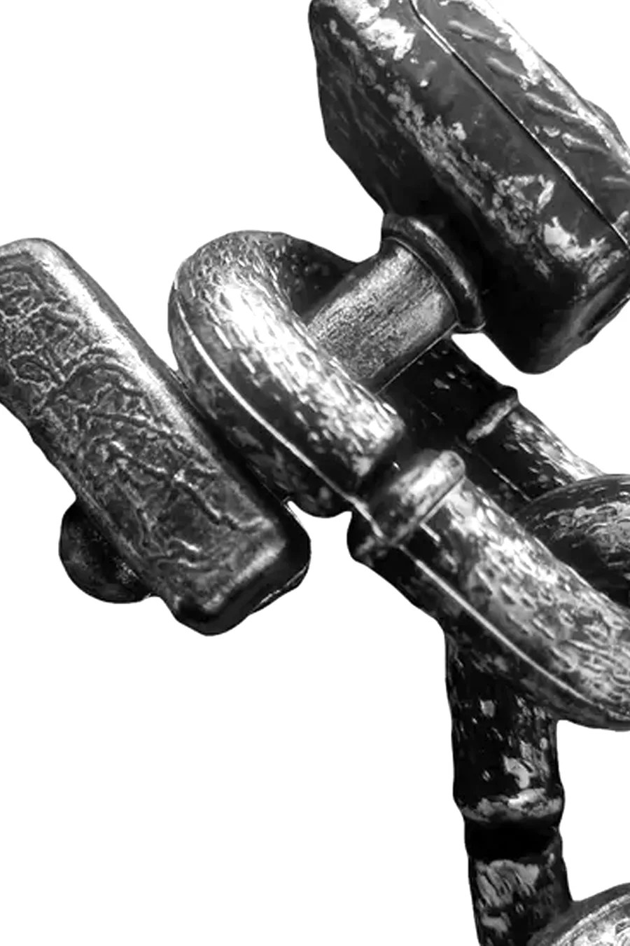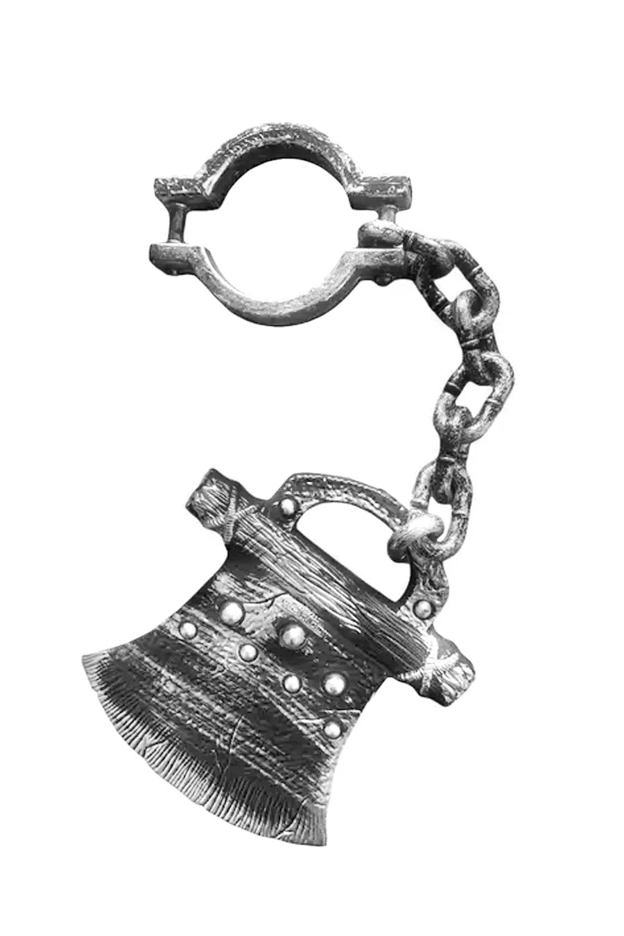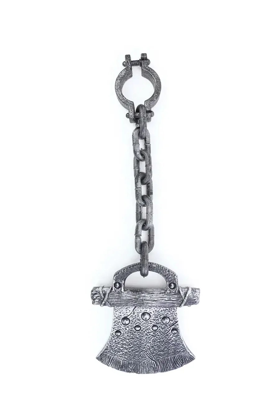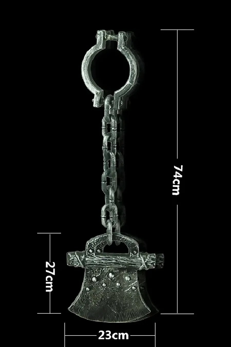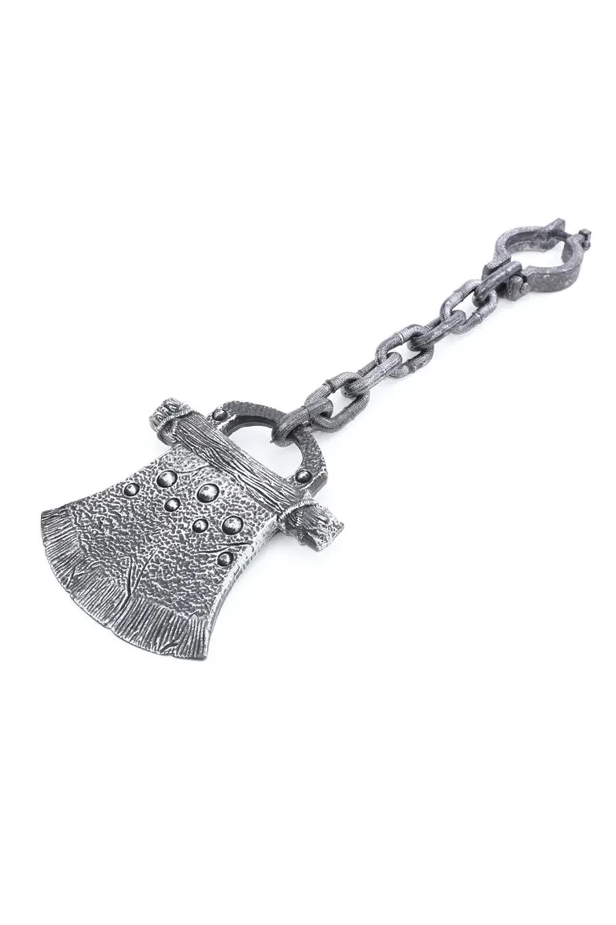 Os enfeites de Halloween serão o ponto alto da sua decoração. Criando uma atmosfera diferenciada, os enfeites e acessórios são ótimos para complementar e deixar sua festa ainda mais linda.  Fabricada em plástico resistente a corrente é ligado ao feixe com algemas em uma extremidade e na outra ponta um machado grande com relevo e ranhuras, pintura em um tom de prata com detalhes em preto para trazer um tom de envelhecido para o material. Poderá ser usado como acessório para complementar fantasias de halloween usando-o nos braços ou nos tornozelos, quanto para decoração de halloween.